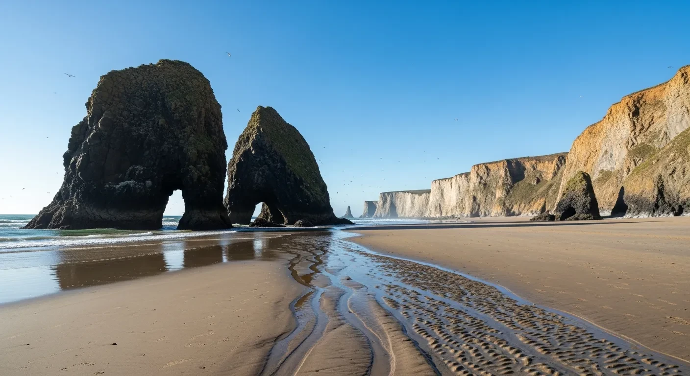 Deux heures avant la marée basse. L'eau recule, dévoile 1 400 mètres de sable fin. Les formations géologiques millénaires se dressent, sculptées grain par grain par l'érosion marine. L'océan a dessiné des voûtes, des galeries, des portails naturels rappelant l'architecture gothique.